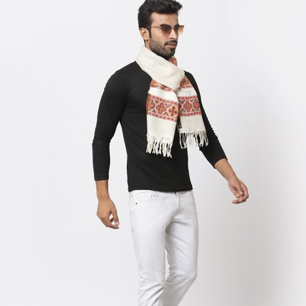 Cream & Orange self design muffler, has fringed borderSize & FitDimensions: 2 m x 0.34 m(Length x Width)Material & CareAcrylicDry Clean
